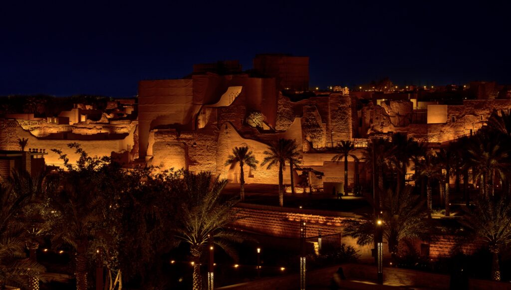 The epic scale and historical significance of the ancient city of At-Turaif come to life after dark in a beautifully layered and nuanced tapestry of golden light.