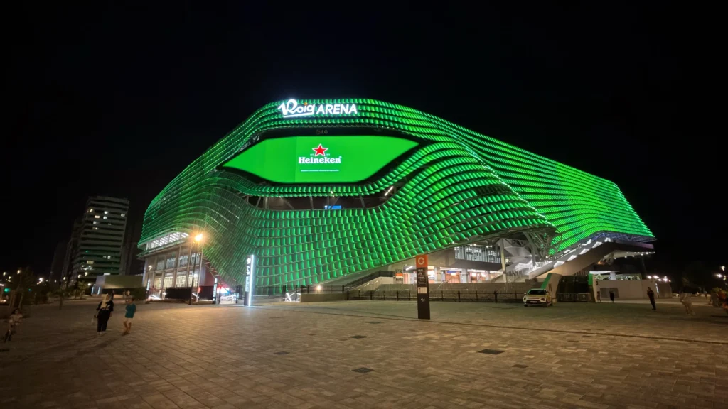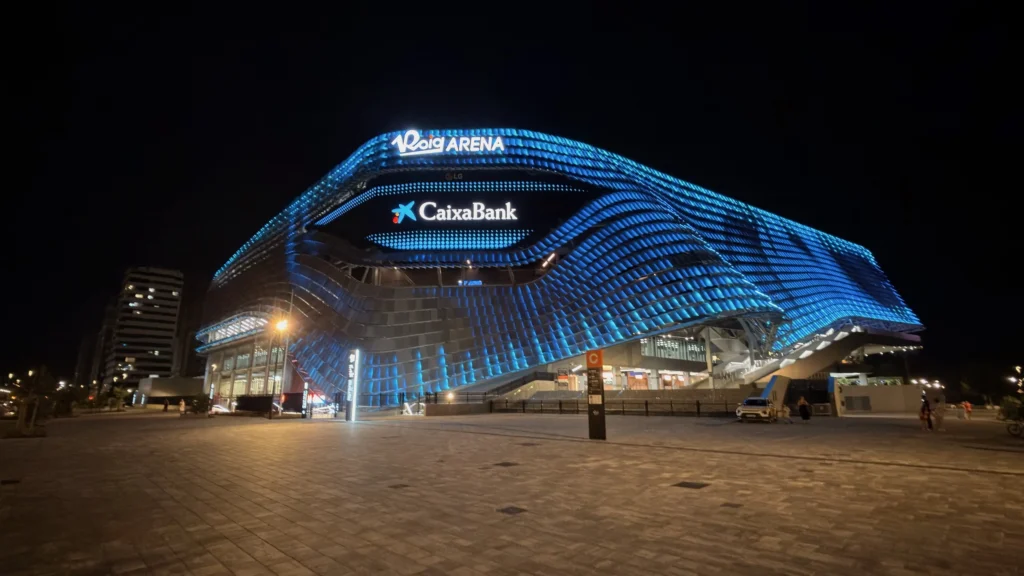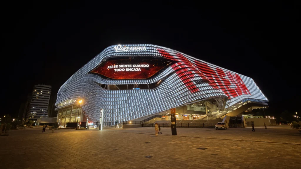 The façade is constructed from 8,600 ceramic panels, each integrated with 26 individually controlled RGBW LEDs. The LED system, specified by Skandal Technologies—the developers of the Poet Creator Software—and designed in partnership with LDC Madrid, was developed and deployed by SACO Technologies Inc. of Montreal, Canada. SACO systems have previously been used in some of the world’s most iconic media architecture projects, including Sphere Las Vegas and the Burj Khalifa in Dubai. Roig Arena in Valencia represents the largest deployment of this technology in Europe.