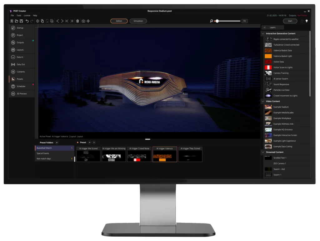 In addition the Poet drives generative changes for the content based on calendar events, seasons, weather patterns and Valencia high-days. Special interaction platform is integrated to the system allowing the operator to open the media facade and the screen for fan experiences and brand activations.