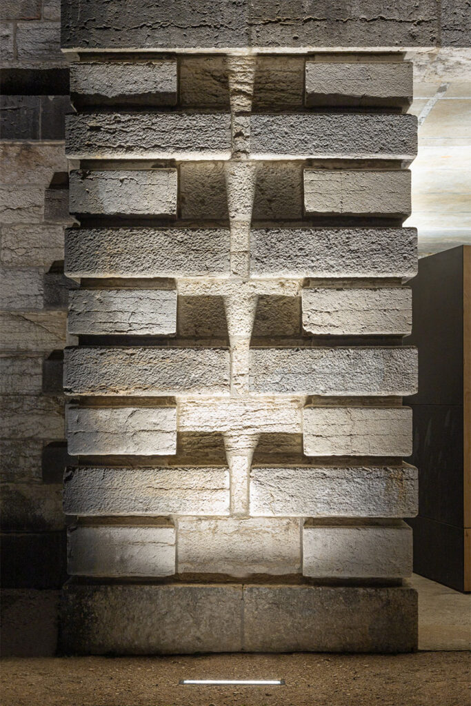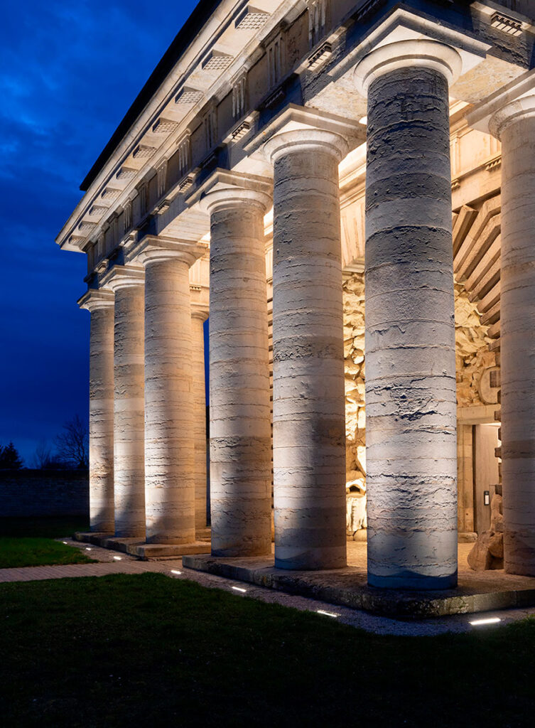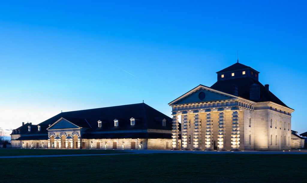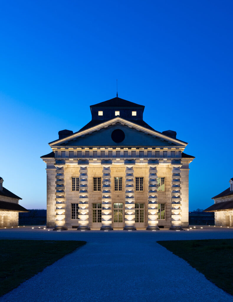 This historical construction, studied in every school of architecture, was taken in hand by the lighting designer Thierry Walger of Le Point Lumineux in Besançon. He focused his efforts almost exclusively on the architecture, leaving the large lawns and surrounding trees in a perfect, natural penumbra that makes the geometric parterres and concentric rows stand out even further.