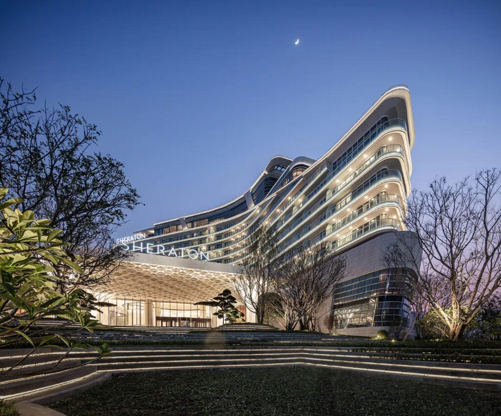The hotel’s lighting design is inspired by the reflection of Xinghu Lake. As night falls and the lights come on, the illumination highlights the architectural features, allowing the building to blend harmoniously with the surrounding mountains and waters, creating a delightful accent to urban mountain and forest living.