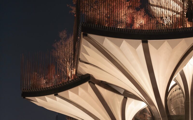 A serene, forest-like after dark experience celebrates the rich material qualities of the architecture and landscape in unexpected and magical ways.